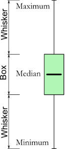 The whiskers can represent a number of things, depending on what type of box plot is presented. In the simplest form, the whiskers represent the minimum and maximum values in a data set. If outlier indicators are shown (typically as small circles above or below the whiskers), the whiskers can represent a variety of ranges, from one standard deviation above and below the mean to between the 9th and 91st percentile of the data.