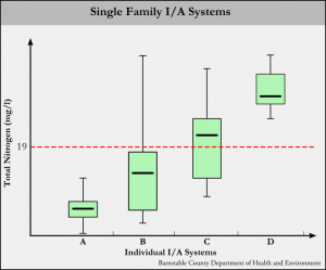 In the figure, the “x” axis represents individual I/A systems, while the “y” axis plots total nitrogen values in milligrams per liter. In the state of Massachusetts, most I/A systems are held to a 19 g/ml effluent total nitrogen standard (shown by the dotted red line).