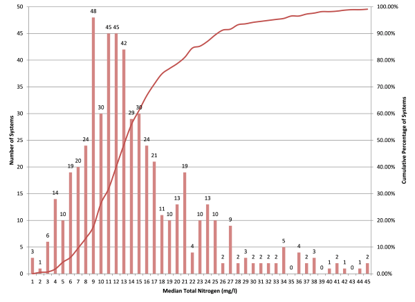 The above chart is actually a two-for-one - containing a histogram of total nitrogen medians and a "cumulative frequency polygon" (a fancy name for a line graph, essentially). The line graph is created by adding each bin to the next from left to right and is expressed as a percentage of the total number of systems. For example, the first bin is 3. Add that to the second bin to get four. Add four to the third bin to get 10, and so on.